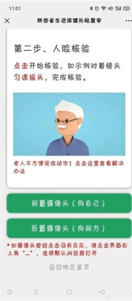 第二步:人脸核验时可选择【前置摄像头】或【后置摄像头】,然后依据语音提示,完成点头、摇头、眨眼等指定动作。