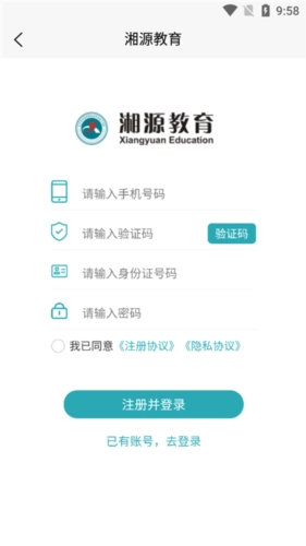 请输入手机号、验证码、身份证号和密码,勾选同意隐私协议后,点击注册并登录。