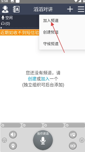 2、点击主界面操作菜单后,会弹出一个包含加入频道、创建频道、守候频道的菜单,例如我们点击加入频道选项,是为了进入频道加入流程从而开启对讲交流。