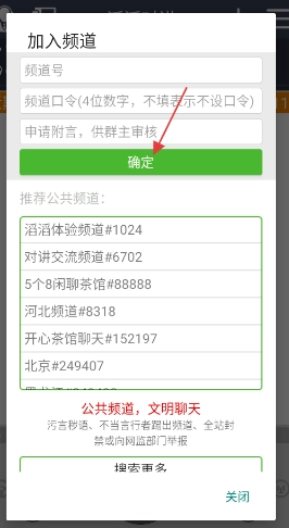3、在弹出的加入频道窗口里,填写频道号、频道口令和申请附言,接着点击确定提交加入申请;要是没有指定的频道,也能从系统推荐的公共频道里挑选并加入。