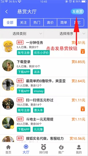 在大厅栏目中点击右上角的发悬赏按钮