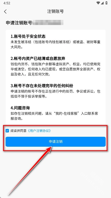 5、仔细阅读并勾选同意《用户注销协议》,然后点击“申请注销”。