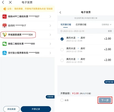 第3步:进入App的【电子发票】功能页面,选择已成功绑定的实体票卡,勾选需要开票的行程,填写相关信息后提交开票申请。