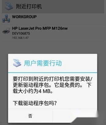 在附近打印机中找到设备后,点击设备会提示要安装驱动包,一定要安装,否则无法打印。