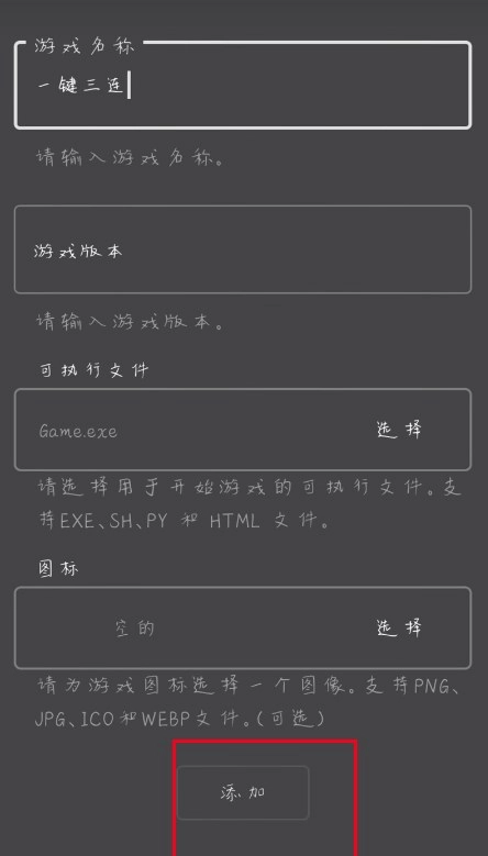 6、点击打开游戏文件,输入游戏的名称和版本信息。