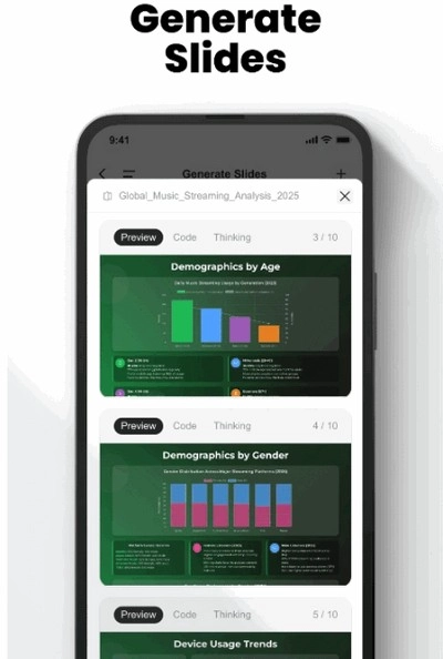 AI 幻灯片制作:从任何文档(如 Word、Excel、PDF)自动生成高质量的幻灯片。自动研究内容,丰富演示文稿。