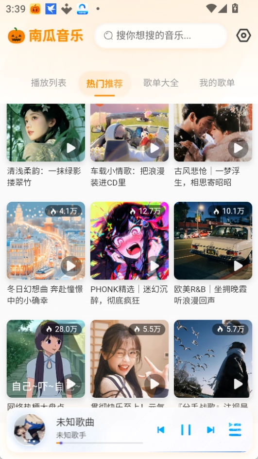 南瓜音乐是一款支持免费收听酷我、抖音等平台歌曲的音乐播放软件,具备播放列表、热门推荐、歌单大全和我的歌单等功能模块,平台的热门榜单会每日同步更新,无论是飙升榜、新歌榜还是热门榜,都会在第一时间完成更新同步。