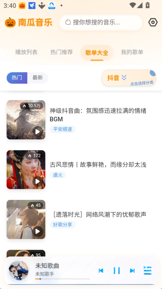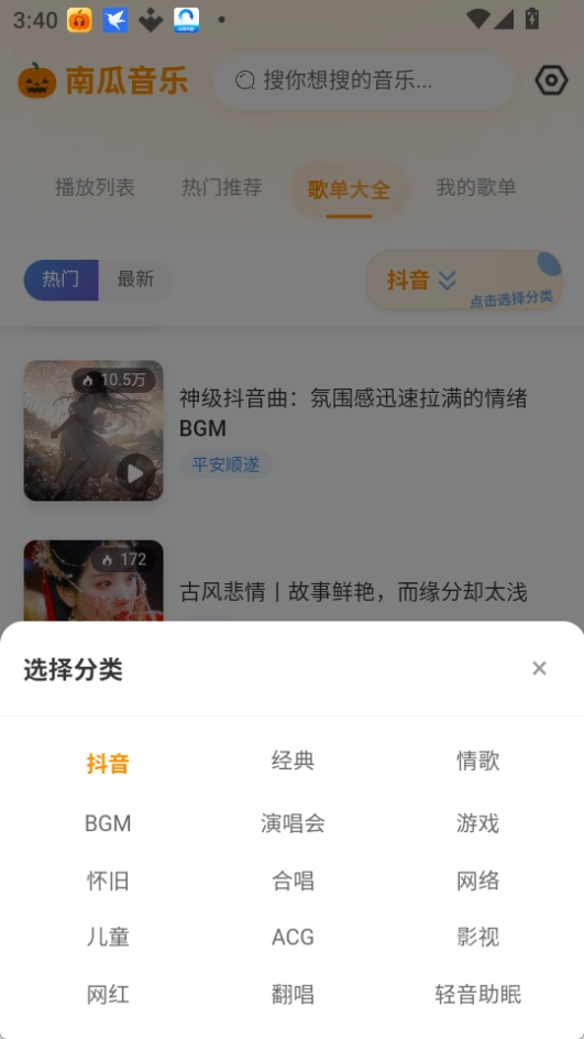 歌单大全:可以浏览和选择各种预设的歌单,包括抖音热门歌曲、网络神曲等。