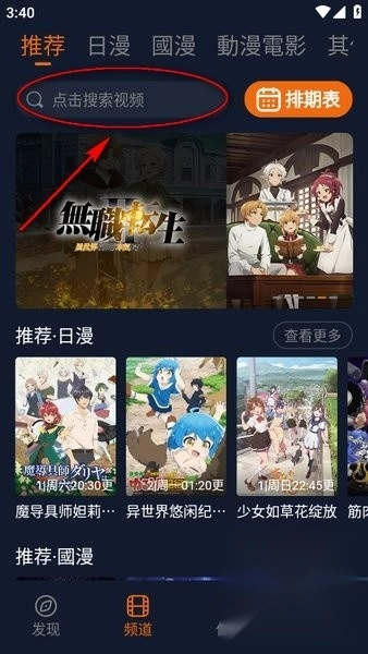 1、启动囧次元应用后,界面顶部的搜索框内会显示提示文字“点击搜索视频”。
