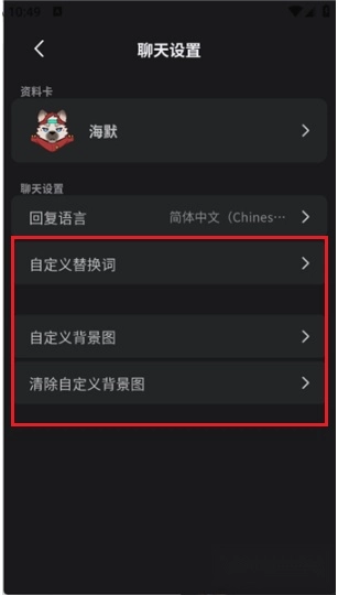 5、此外,还能借助右上角的菜单,对语言、替换词以及背景图进行设置,打造专属于自己的聊天体验。