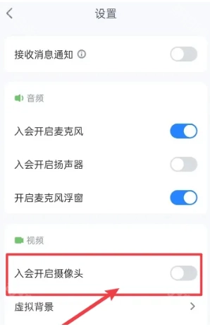 3、进入设置界面后,找到【入会开启摄像头】这个选项,将其关闭即可。