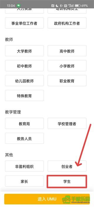 4、下滑到最下面,在其他选项中,点击“学生”,在点击“进入UMU”。