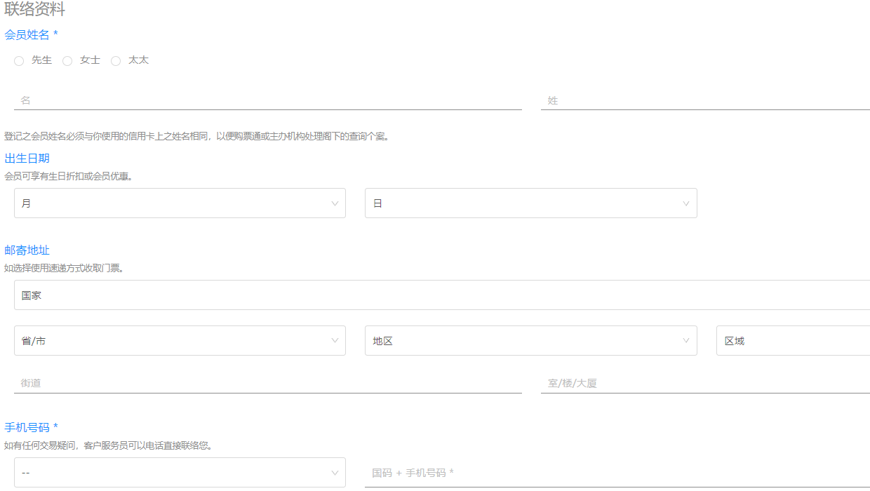 输入邮箱,设置密码之后,需要填写你的个人资料。包括:姓名、出生日期、邮寄地址、手机号码。带*的可以免填,如果你觉得暂时不需要填写未带*部分的话,那么可以直接跳过不填。但邮寄地址建议填写上,特别是在抢票的时候,如果你需要邮寄门票,可以节省填写地址的时间。