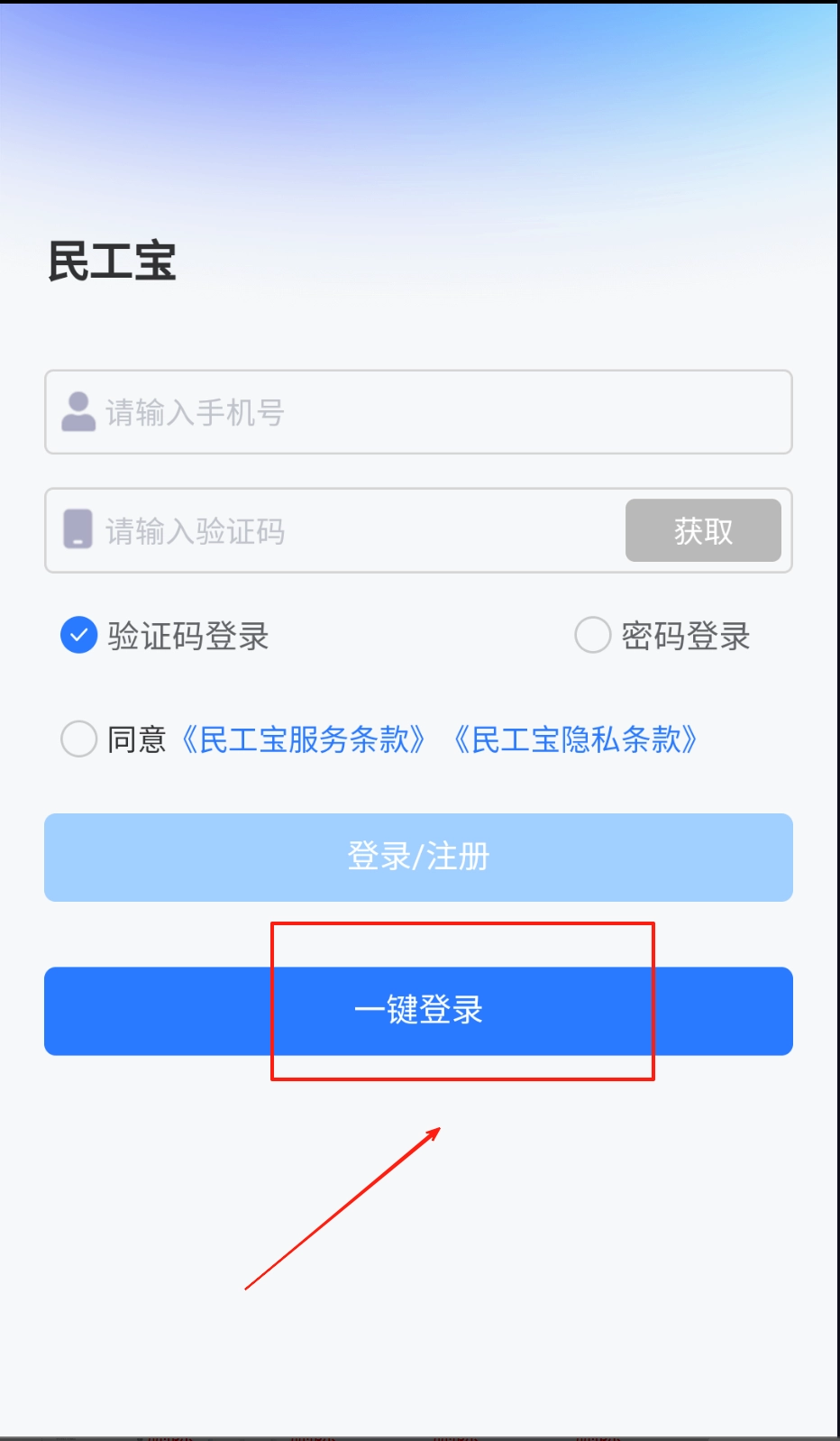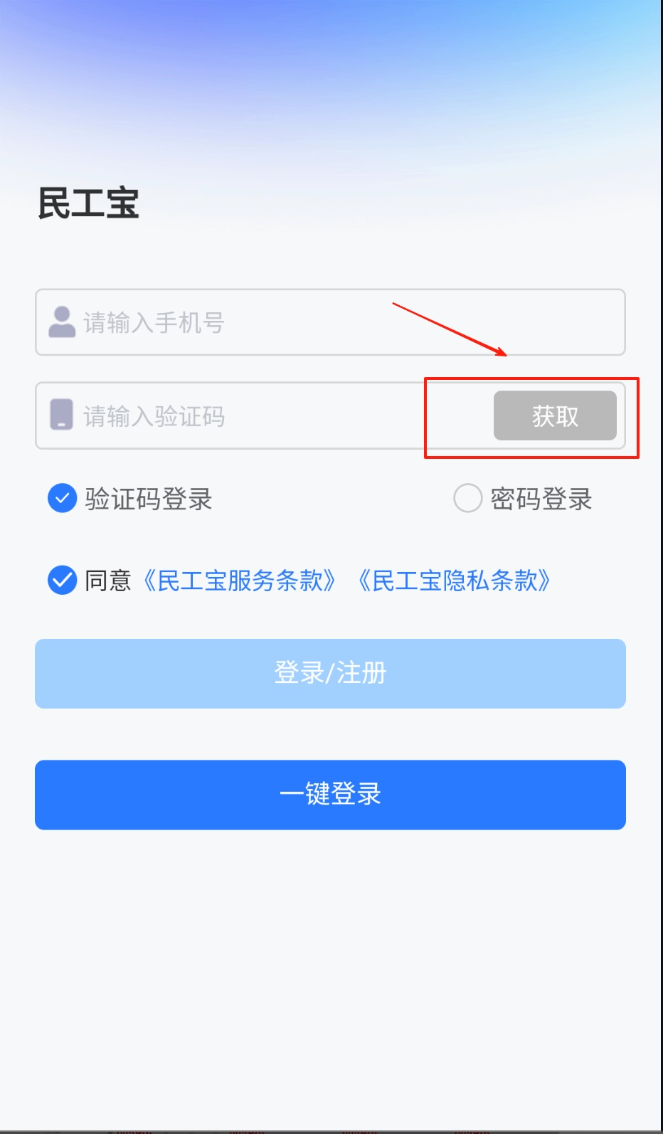 2、若选验证码登录需先点“获取”按钮,60秒内填写收到的短信验证码,核对手机号无误后勾选服务条款和隐私政策再点登录注册按钮。