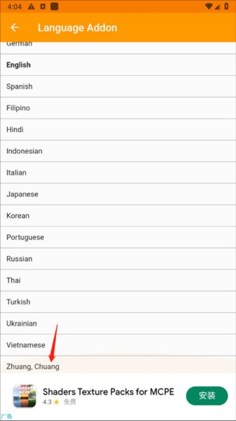 3、继续拖到最下面选择中文,如下图所示,选择简体中文。
