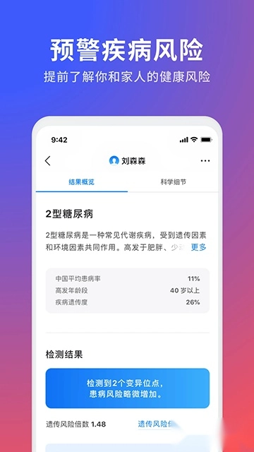 发现你基因中可能致病的变异位点,涵盖哮喘、高血压、糖尿病、冠心病等46种常见疾病。