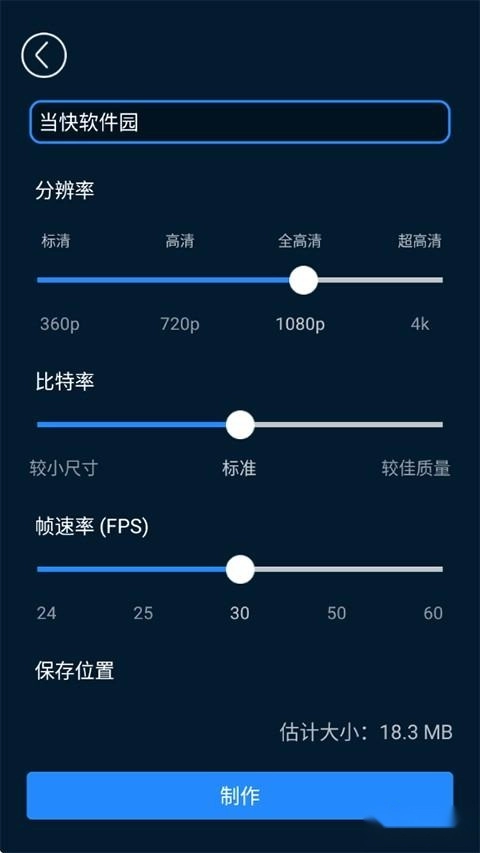 4、在导出界面给视频命名,设置好分辨率、比特率、帧率和保存路径等参数,确认无误后点击下方的制作导出按钮,将视频保存到本地。