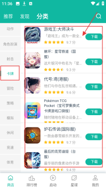 3、选择卡牌分类后,可浏览该分类下的游戏,点击游戏旁的按钮啦。