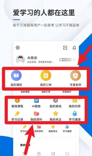 3、在个人中心页面点击我的资料、我的课程等图标,或点击下方可快速进入学习资源管理和查看学习进度。