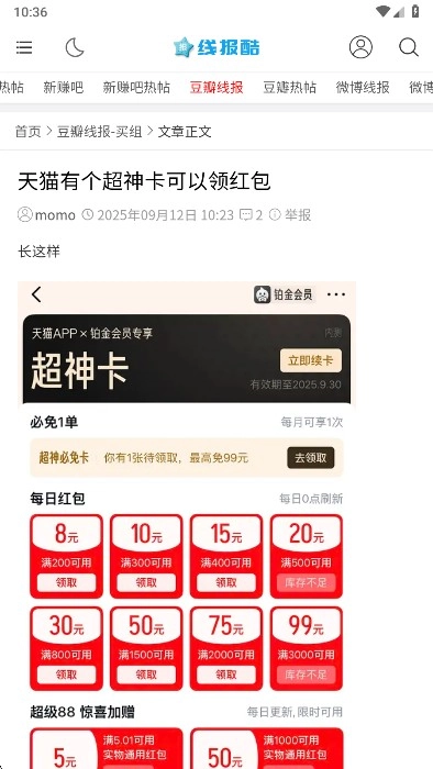 线报酷是一个将“羊毛党”信息打造成个性化门户的综合线报平台,每日实时整合淘宝、京东、拼多多的秒杀活动,以及话费红包、游玩优惠、银行活动等全网福利内容,借助千人千面的算法,把最贴合你需求的优惠信息第一时间推送至你面前,真正实现打开就能“薅羊毛”。平台的信息流采用卡片样式,清晰呈现出活动平台、类型、有效期等关键信息,大大提升了浏览效率。