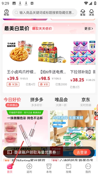 1、首页有搜索栏搜商品优惠,展示最美白菜价、今日好价板块,含王小卤鸡爪等商品,还有拼多多等平台分类入口。