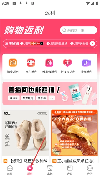 2、返利页面设有多平台返利入口,提供三步省钱操作流程,直播间支持返佣功能,并展示轻臣拖鞋、王小卤凤爪等可参与返利的商品。