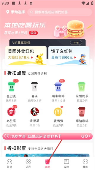 3、本地页面,聚焦本地吃喝玩乐,有外卖红包,星巴克等折扣点餐,还有折扣影票,覆盖本地生活优惠。
