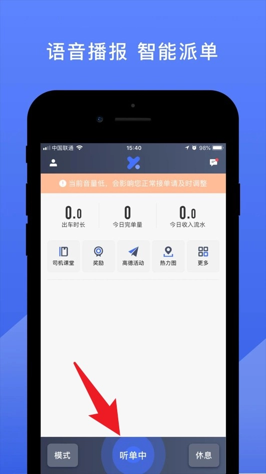 2、登录后点击听单中即可开始接单,平台将自动为您推送附近订单。