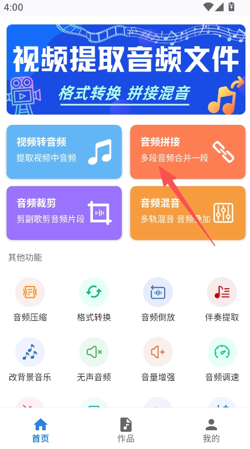 1、打开视频转换音频,点击音频拼接板块。