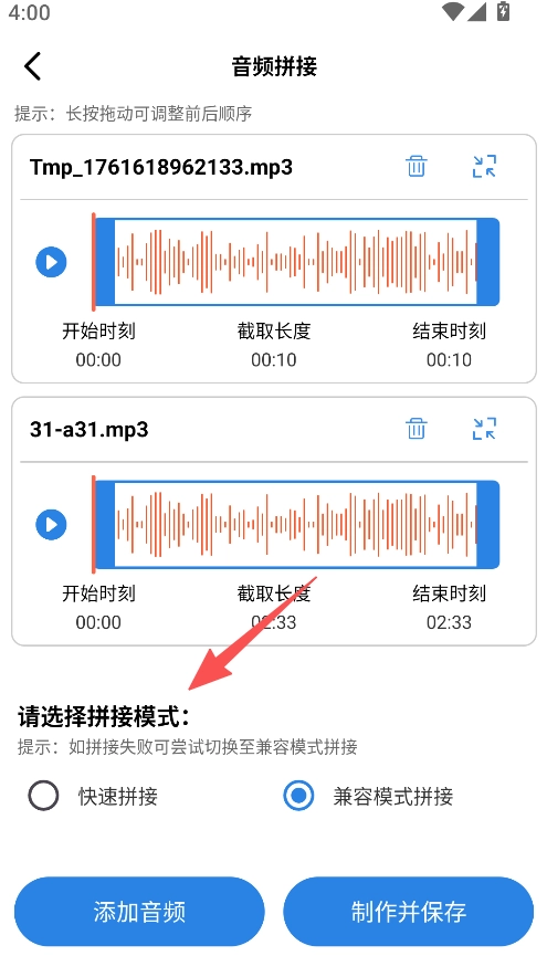 3、提供多拼接模式选择,含快速及兼容模式,适配不同音频拼接的需求。