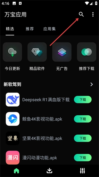 1、在【万宝应用】首页,点击右上角的搜索图标,可进入搜索界面,以便查找特定应用。