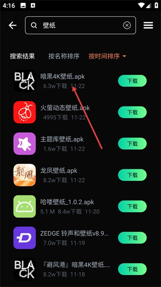 3、搜索【壁纸】后,页面会呈现相关应用列表(例如【暗黑4K壁纸.apk】),你可以根据自身需求挑选应用并查看其详情。