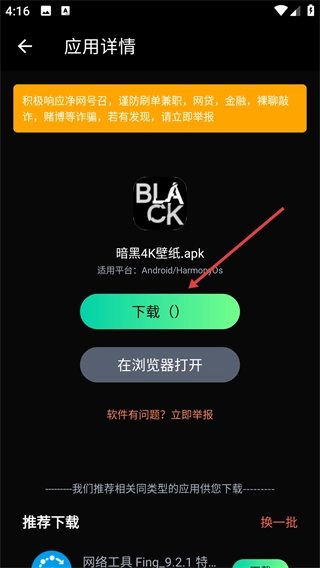 4、进入《暗黑4K壁纸.apk》的应用详情页面后,点击【】按钮即可获取该应用,另外也可以选择【在浏览器打开】这一选项。
