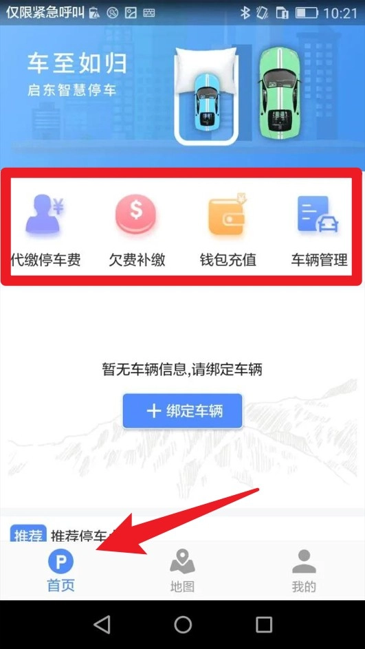2、进入首页后可看到代缴停车费、钱包储值、欠费补缴等功能,首次需关联车辆才能进行操作。