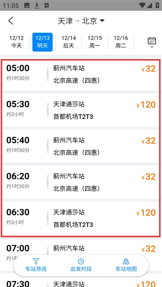 4、查询后会展示【天津-北京】的车次列表,包含发车时间、车站及票价,还可通过【车站筛选】等功能细化查找适配车次。