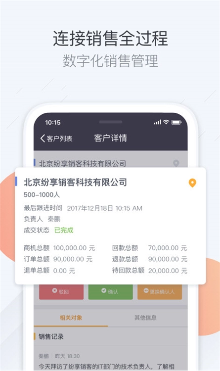 纷享销客CRM是一款专为企业打造的移动销售管理工具,具备客户信息管理、销售流程追踪以及业务协同等核心功能。平台整合了客户从初次接触到长期维护的全生命周期数据记录,并配备移动端的审批、日程安排、任务管理等办公组件,能够满足销售团队日常工作的需求。依托云端技术架构,用户可以在各类设备上查看和处理部分业务数据,轻松实现跨地域办公。此外,该应用还融入了基础OA功能,例如内部沟通与流程审批等,助力企业提升内部协同效率。