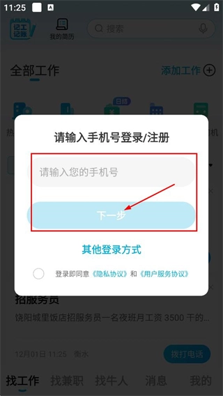 2、在弹出的请输入手机号登录/注册窗口里,填写请输入手机号,点击下一步。