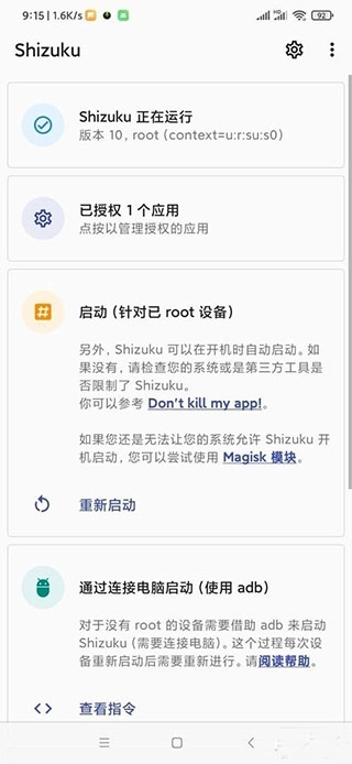 (命令:adb shell sh /data/user_de/0/moe.shizuku.privileged.api/start.sh)