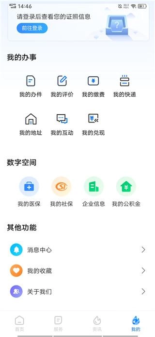 “我的”版块设置个人/企业信息,证照信息,我的办事,数字空间等栏目,实现办件实时跟踪,服务全过程留痕、电子资料随心存等智能化数字化功能。