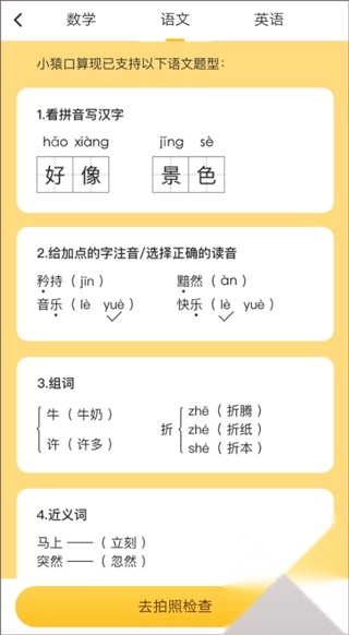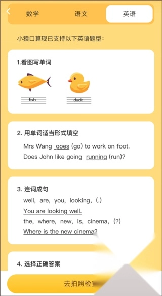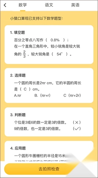 2、多种题型,准确校正:支持口头算术、垂直计算、单位换算、选择题、判断题、单词题、填空题等题型的检查,准确率高;