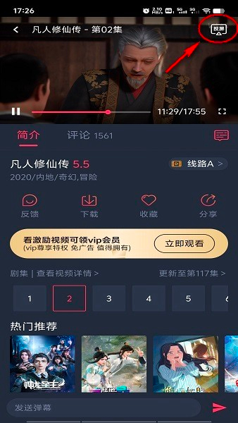 2、进入播放详情页面,触碰任意播放屏幕以弹出菜单,如图所示,然后选择"投屏"。