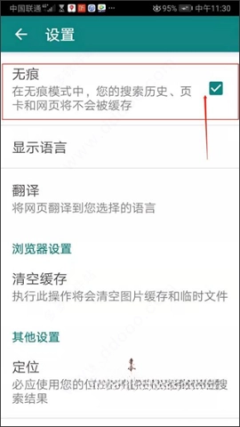 4、在设置页面勾选【无痕】模式,完成设置。