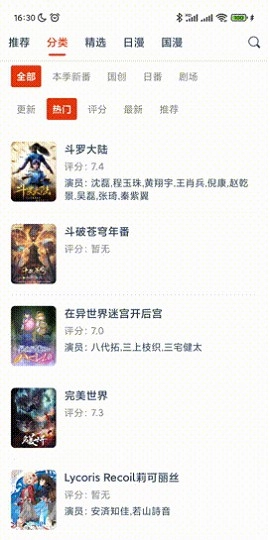 2、分类页面,比较简洁,就只有几个日漫、国漫、剧场这些分类,然后还有更新、热门、评分、最新、推荐。