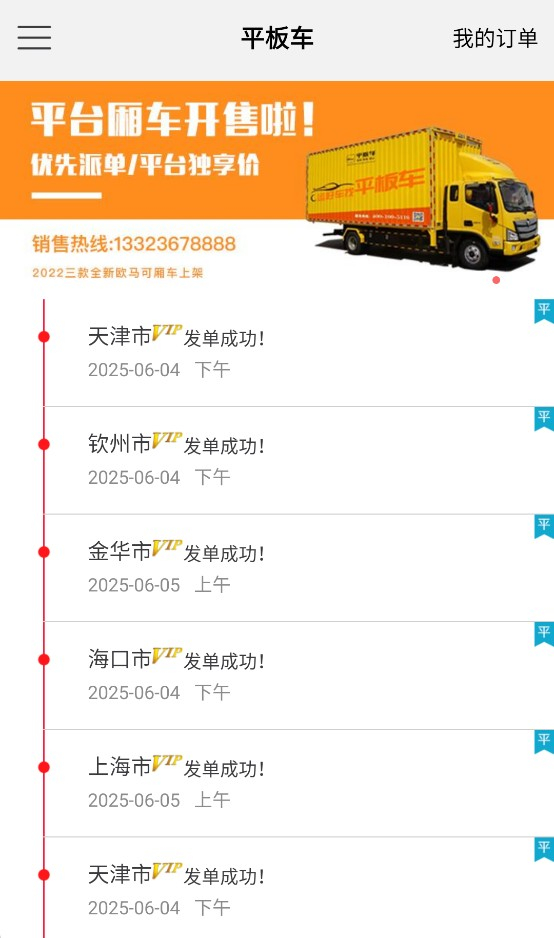 2、点击进入平台车页面可查看不同城市的下单成功记录,包含时间与发车地,方便用户实时掌握订单动态。