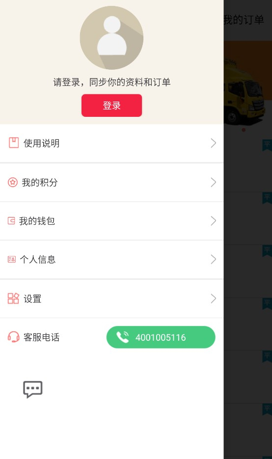 3点击左上角的菜单按钮可以打开侧边栏,其中包含登录入口、积分、钱包、设置、个人信息以及客服电话等功能选项。