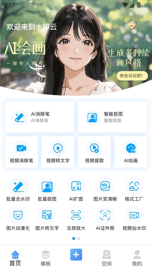 水印云软件的免费版本集成了不少实用功能,像批量去除水印、批量图像抠取、AI图像扩展、图片清晰度增强等都在其中。