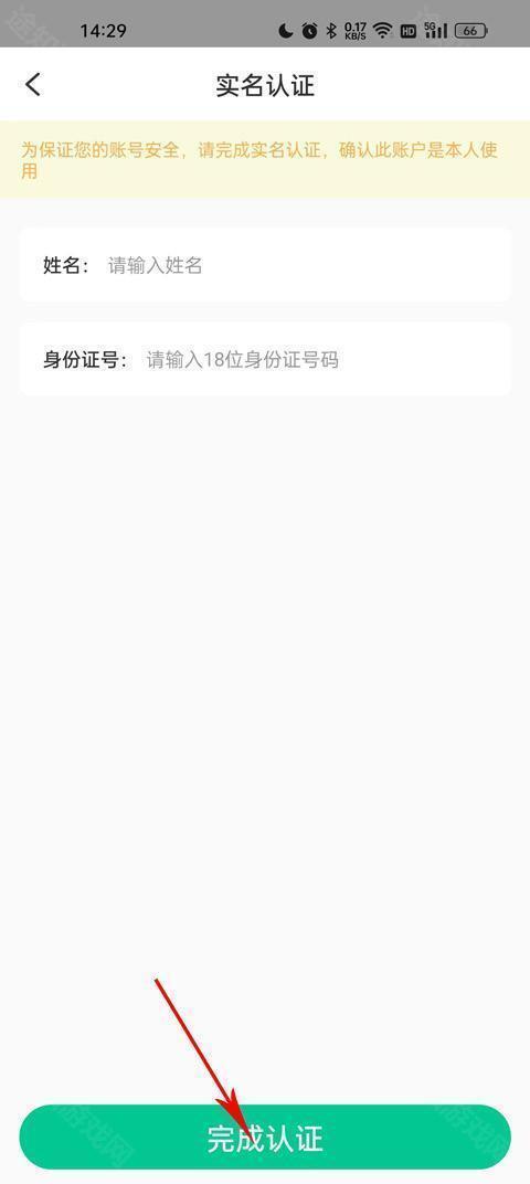 进入实名认证页面后,填写姓名与身份证号,再点击完成认证按钮,就能完成实名认证流程。