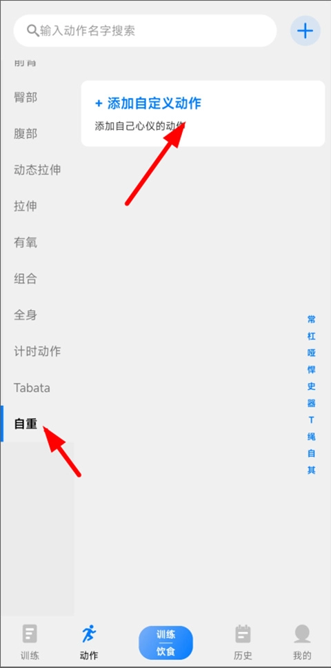 在动作页面左侧的肌肉部位栏下拉找到“自重”选项,然后点击添加自定义动作。