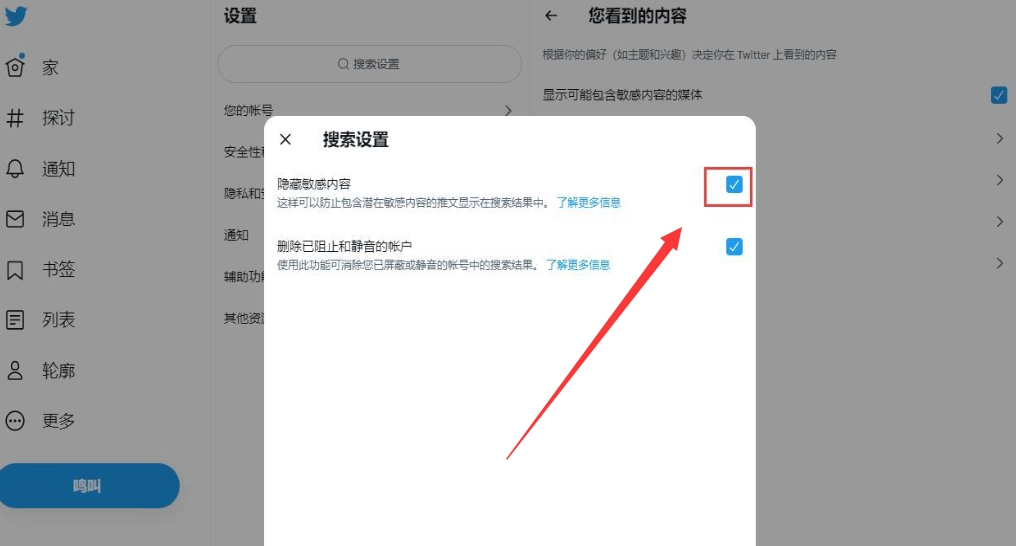 在“您看到的内容”这一栏目的列表里,勾选“显示可能包含敏感内容的媒体”这一选项,之后再点击“探索设置”按钮。