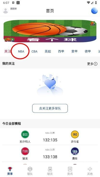 1、打开软件后,进行赛事界面,包括NBA、CBA、英超、西甲、意甲等各种赛事,这里以NBA凯尔特人队为例,